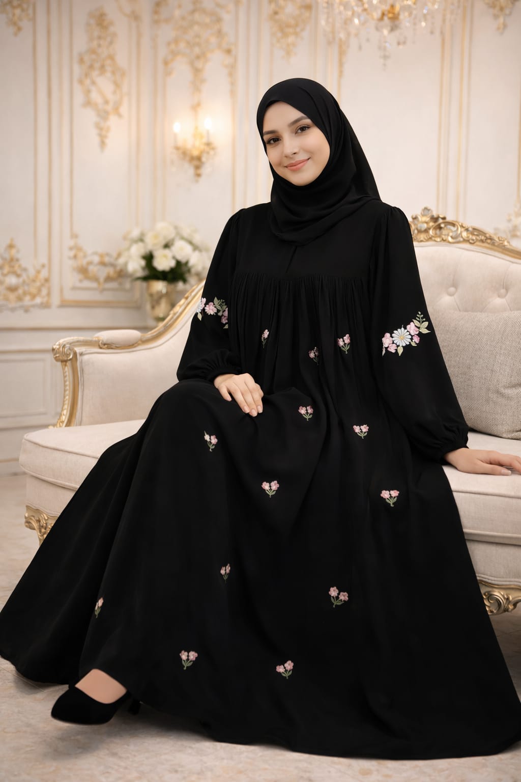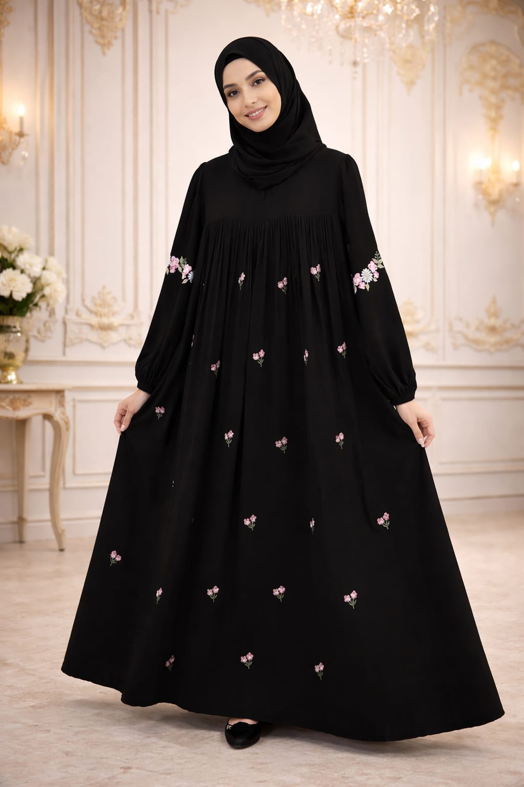 ম্যাচিং লং হিজাব, যার মাপ ৮০/৩০ ইঞ্চি — যা স্টাইলের সাথে পুরোপুরি কাভারেজ দেয়।